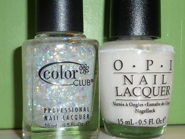 Jeg har 3 lag Covered in Diamonds (fra Color Club) på. Den er lidt tyk i det med, så den er ikke så nem at arbejde ned på neglen. Det er svært at få et jævnt lag. Så glitter flagerne er en smule sporadiske. (hist og her).